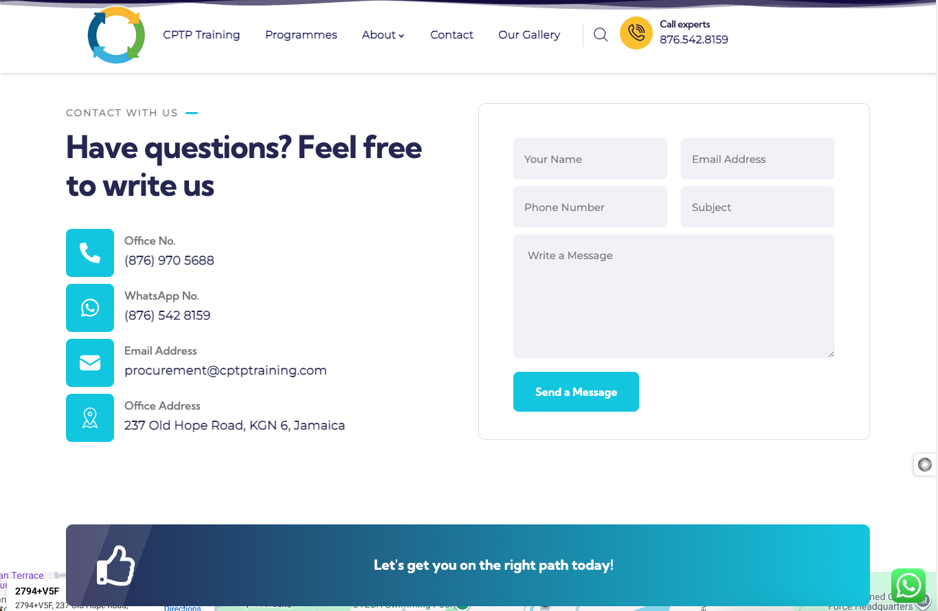 - Prominent contact points: phone numbers, WhatsApp contact, email address and physical address in the footer.